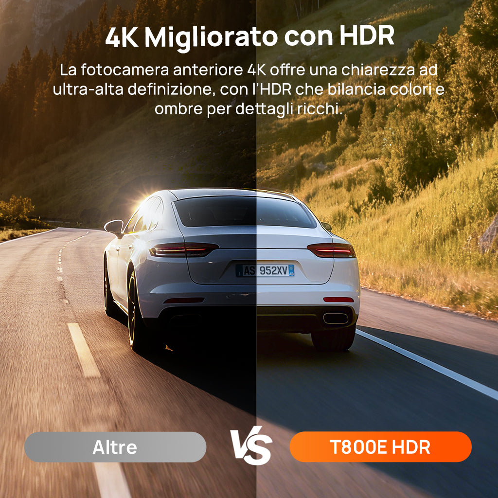 La 4K T800E dispone di un'avanzata telecamera anteriore 4K a 24 fotogrammi al secondo, che offre una chiarezza in altissima definizione con una gamma dinamica estesa per immagini realistiche. Grazie alla tecnologia HDR (High Dynamic Range), cattura uno spettro di colori più ampio e bilancia luci e ombre per immagini ricche di dettagli, profondità e vivacità. Inoltre, supporta la registrazione a 1080P sia per la visuale interna che per quella posteriore, garantendo una copertura completa senza compromessi sulla qualità. Che si guidi sotto la luce solare intensa, cieli nuvolosi o attraverso rapidi passaggi in tunnel e sottopassi, la 4K T800E assicura che ogni fotogramma rimanga nitido e fedele alla realtà.