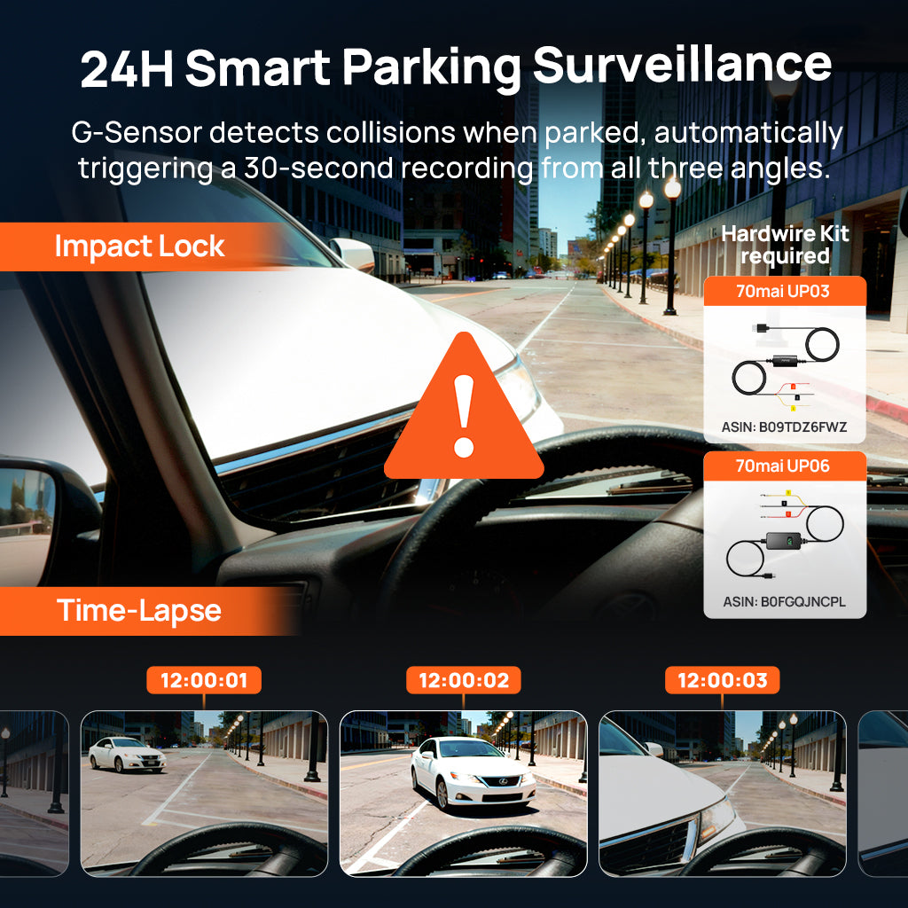 Sorveglianza Parcheggio Intelligente 24H: Include il rilevamento delle collisioni tramite sensore G che attiva automaticamente una registrazione di 30 secondi da tutte e tre le angolazioni se viene rilevato un impatto durante la sosta. È disponibile anche la registrazione Time-Lapse a 1 FPS per una registrazione continua di 24 ore con un consumo energetico bassissimo.