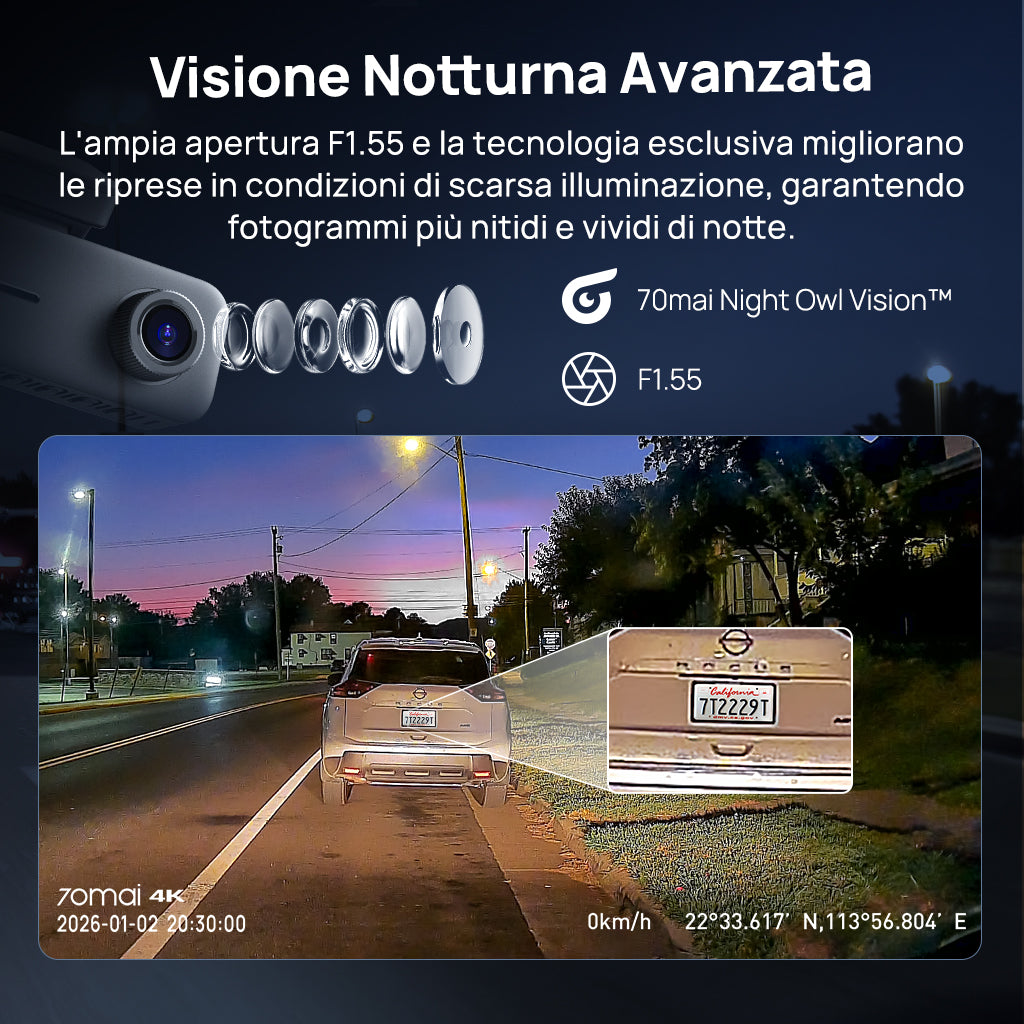 Super Visione Notturna: Dotata di un'ampia apertura F1.55 per immagini più luminose e dell'esclusiva tecnologia 70mai Night Owl Vision™ per ridurre il rumore, bilanciare l'esposizione e migliorare il controllo dell'abbagliamento per riprese notturne più nitide.