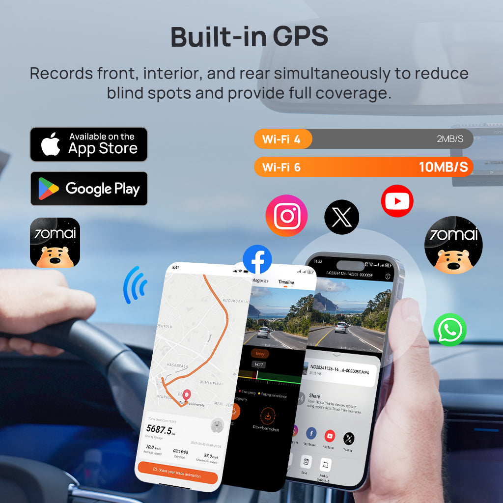 Registra velocità, ora e coordinate precise, fornendo prove inestimabili in caso di incidente. Registra automaticamente il percorso, visualizzabile tramite l'app 70mai, assistendo notevolmente nell'ottimizzazione dei tragitti.