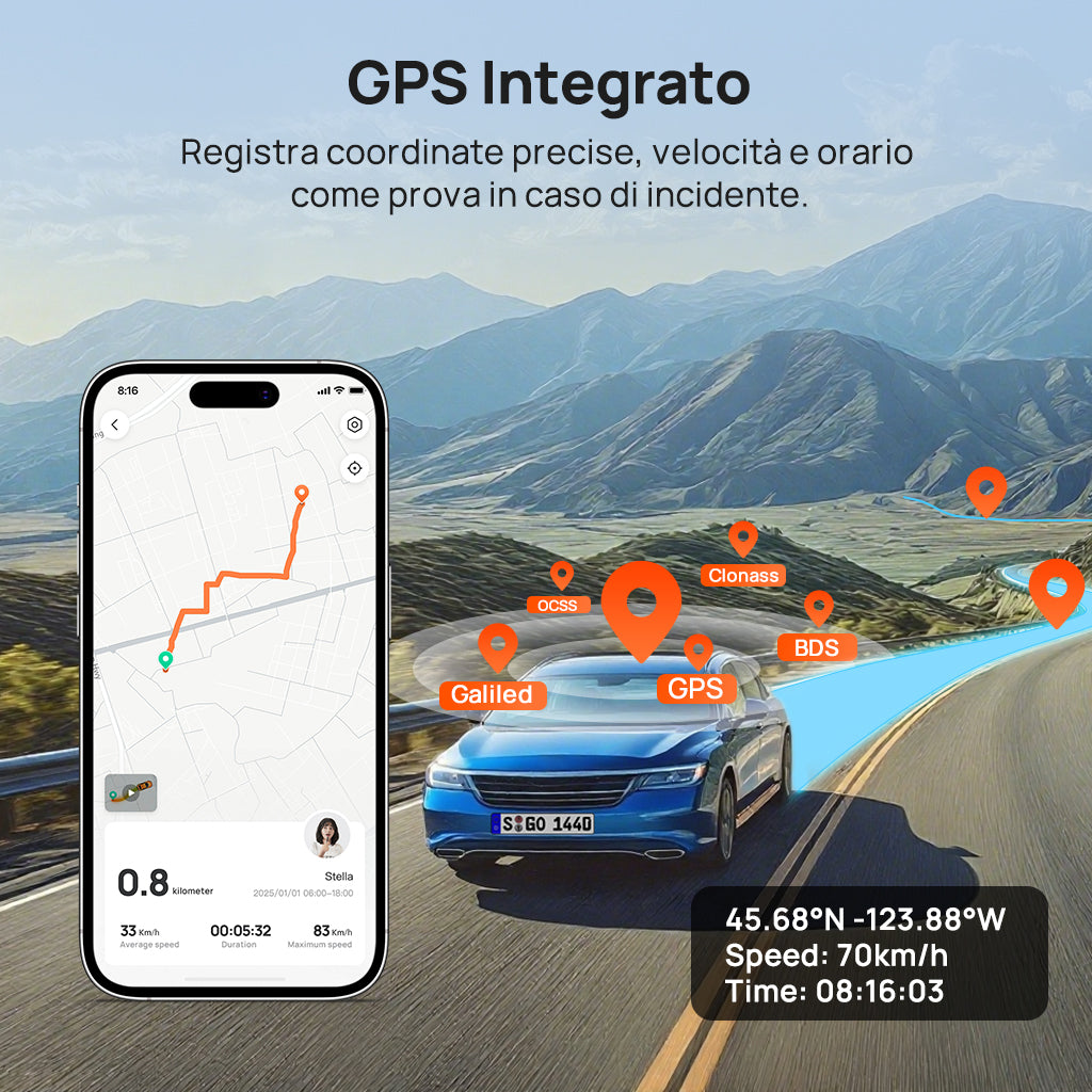 GPS Integrato: Registra velocità, ora e coordinate precise, fornendo prove inestimabili in caso di incidente.