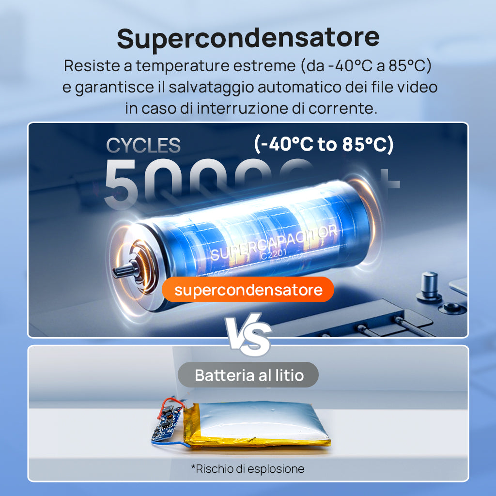 Hardware Affidabile: Utilizza un supercondensatore in grado di resistere a temperature di esercizio estreme (da -40°C a 85°C) e vanta una lunga durata, garantendo che i video vengano salvati automaticamente anche in caso di interruzione di corrente.