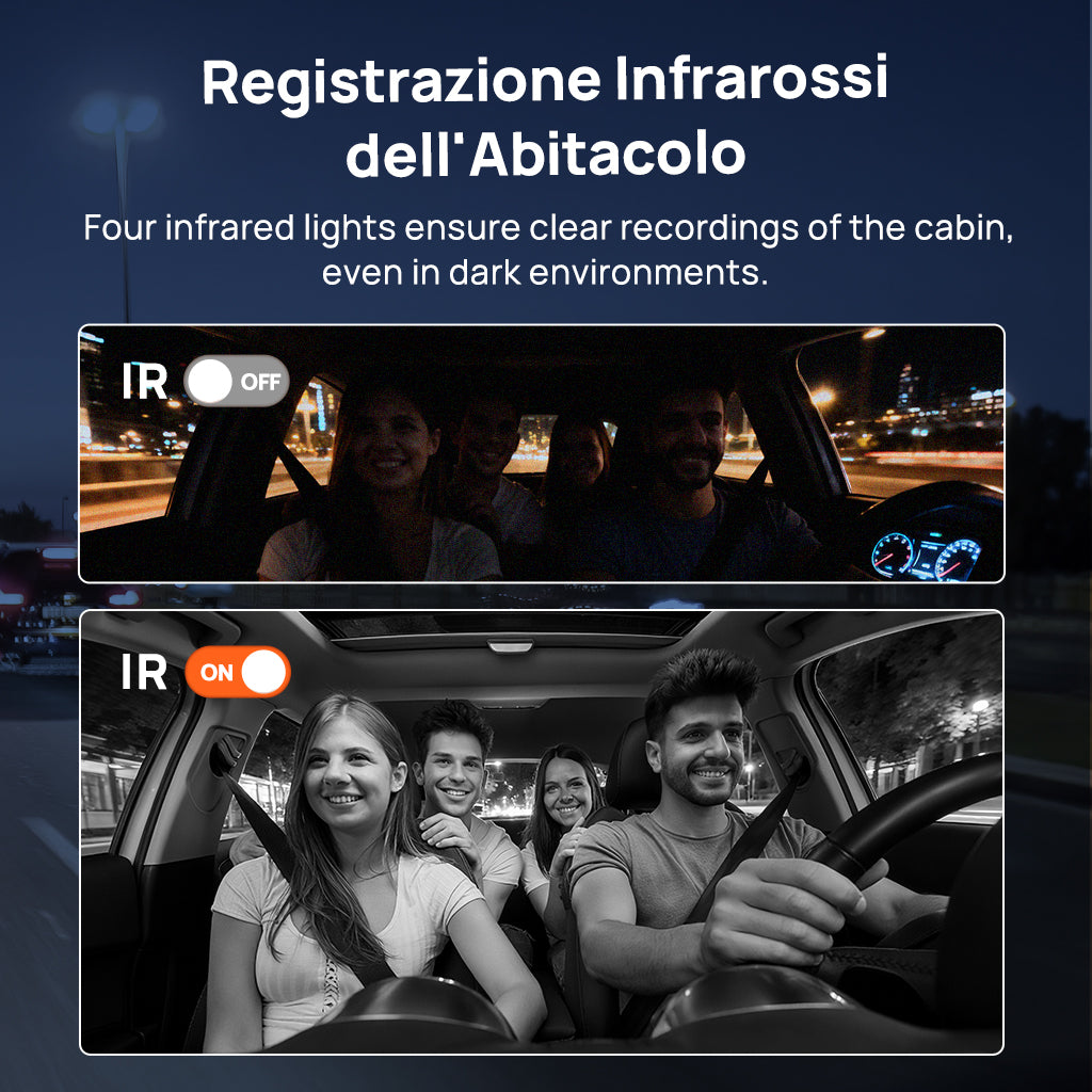 Memoria Espandibile: Supporta una scheda MicroSD fino a 512 GB, consentendo 10 giorni consecutivi di registrazione (calcolando 2 ore di guida al giorno) senza sovrascrittura.