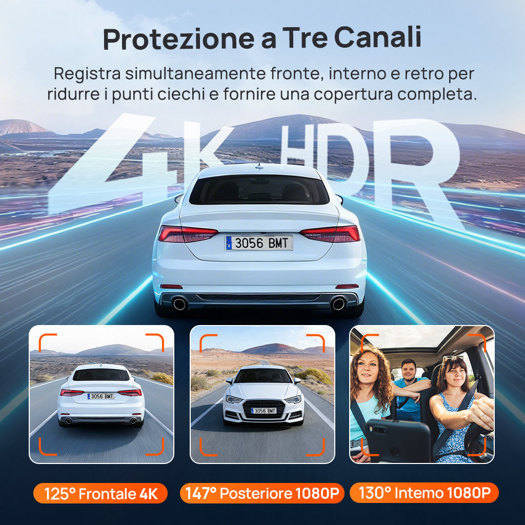 Protezione a Tre Canali: Il sistema registra simultaneamente la parte anteriore, l'interno e la parte posteriore del veicolo, riducendo i punti ciechi e garantendo una copertura completa. È ideale per i conducenti quotidiani e per gli operatori di ridesharing.