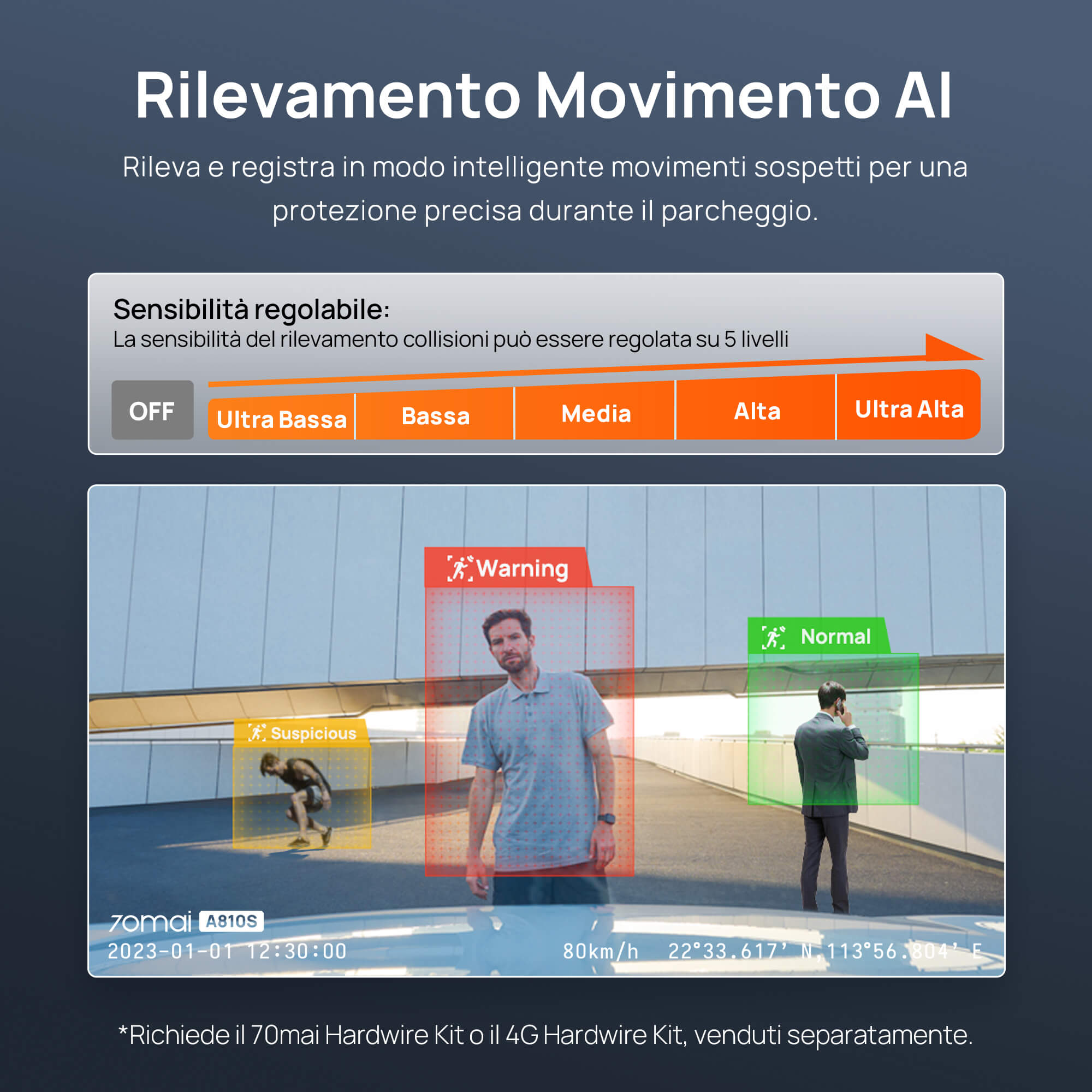 Il Rilevamento del Movimento AI individua istantaneamente movimenti sospetti vicino al veicolo, attivando una registrazione sincronizzata di 30 secondi da entrambi i canali. (Richiede un Kit Hardwire 70mai o un Kit Hardwire 4G).