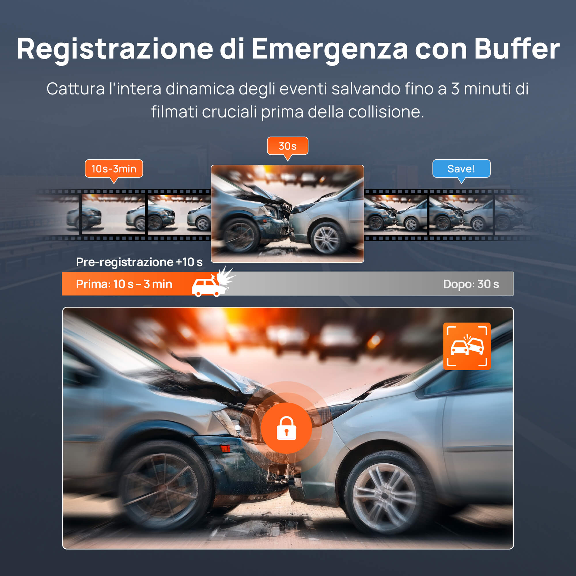 La nuova Registrazione di Emergenza con Buffer cattura fino a 3 minuti di filmato prima che venga rilevata una collisione, preservando l'intera catena degli eventi.