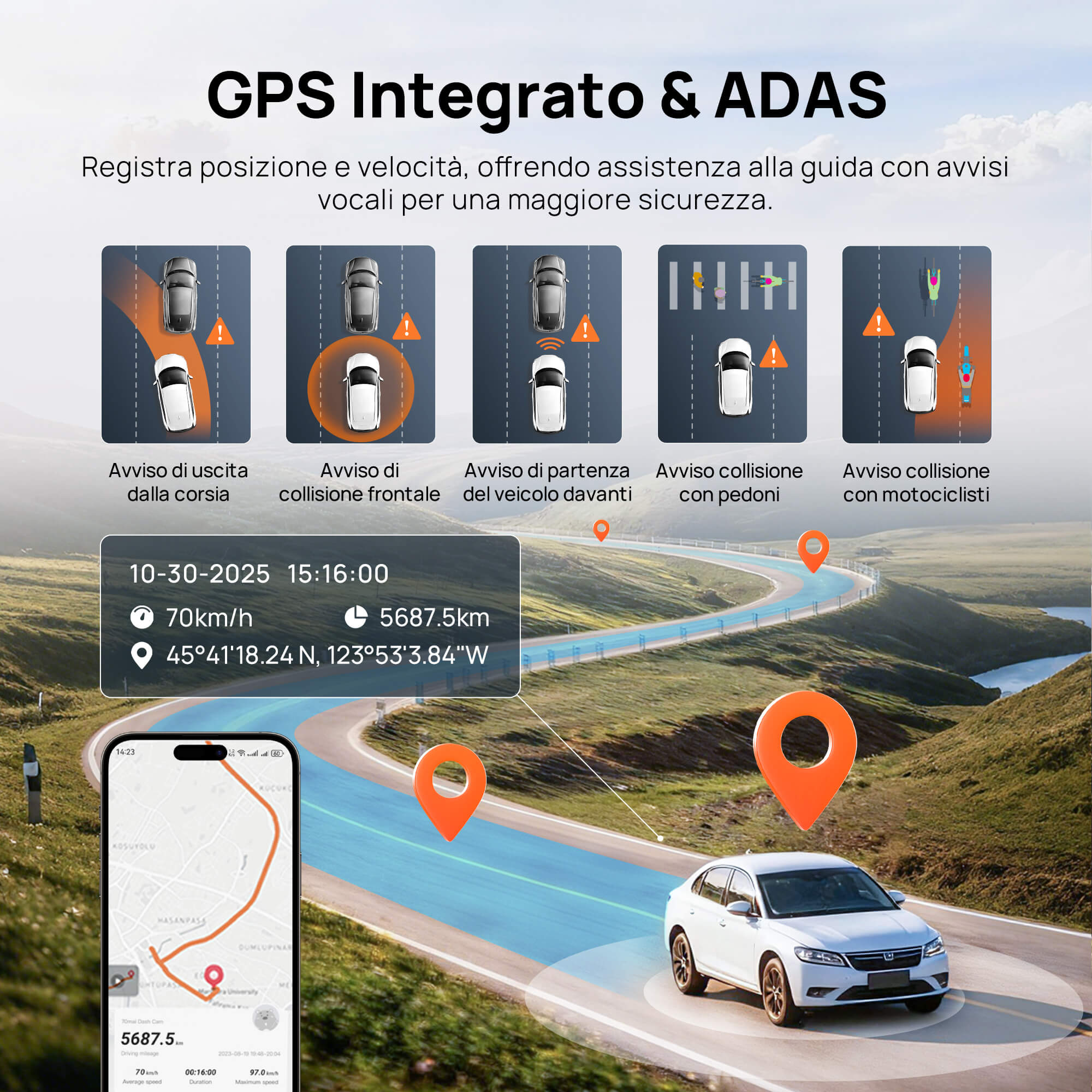 Individua comodamente la tua posizione in tempo reale, registra velocità e ora e ti assiste con avvisi vocali su uscita di corsia, distanza dal veicolo davanti e attenzione ai pedoni, aggiungendo un ulteriore livello di sicurezza al viaggio.