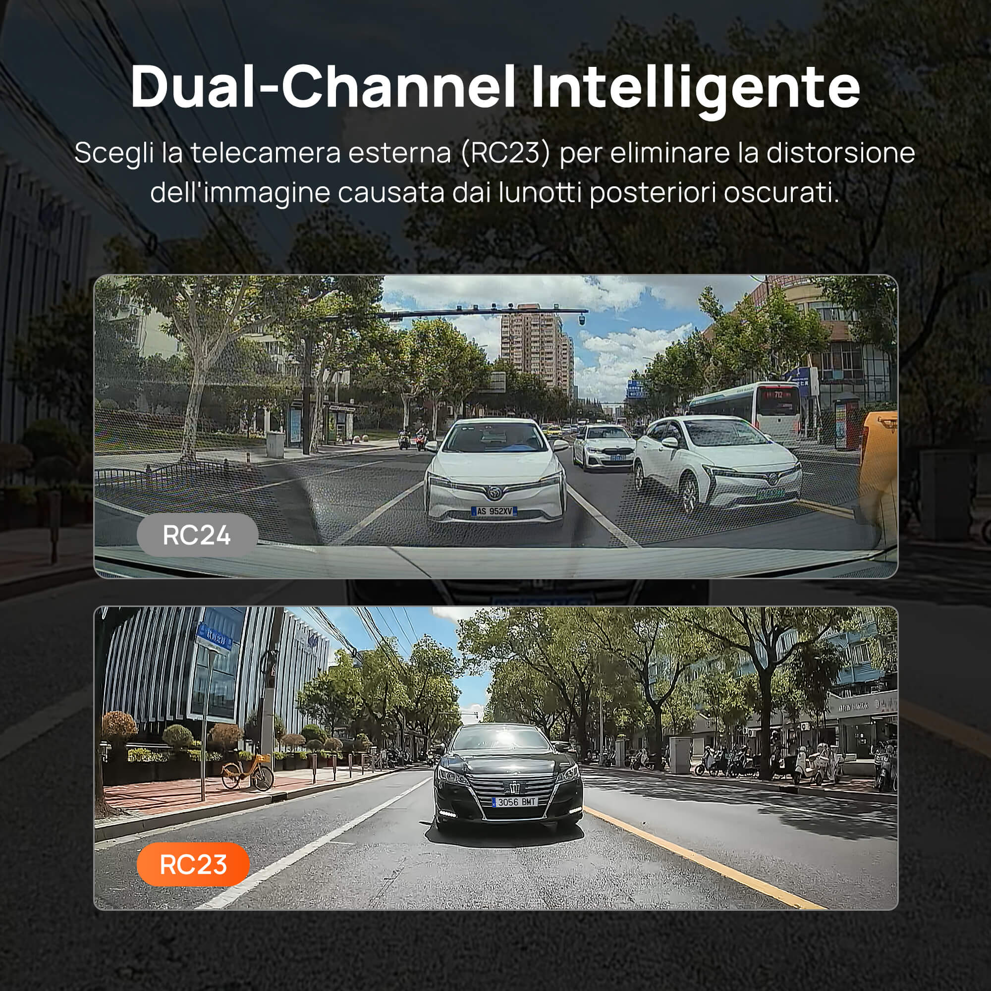 La 4K A810S offre una registrazione a doppio canale fondamentale. Ora consente di scegliere tra una retrocamera interna o una camera di retromarcia esterna, entrambe con sensore Sony. Queste camere posteriori supportano registrazione fluida e nitida a 30 FPS con HDR e possono essere visualizzate insieme al video anteriore tramite modalità Picture‑in‑Picture.