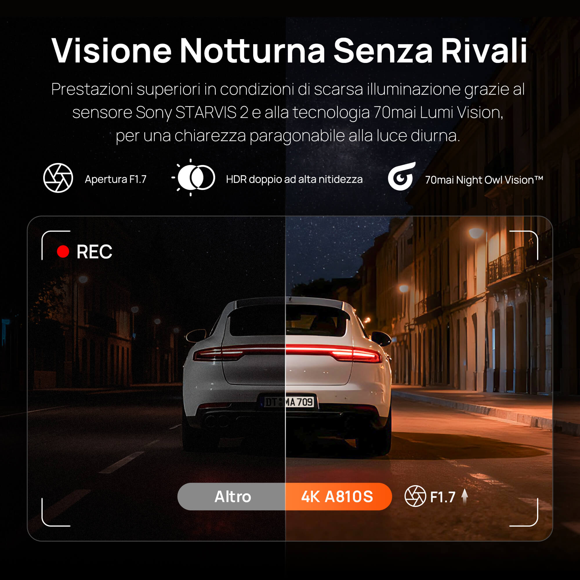 La 4K A810S offre riprese notturne senza pari grazie alla tecnologia Sony STARVIS 2 e a 70mai Night Owl Vision™. Queste funzioni migliorano l’esposizione, riducono il rumore e controllano l’abbagliamento, fornendo immagini chiare ed equilibrate durante la guida in condizioni di scarsa luce.